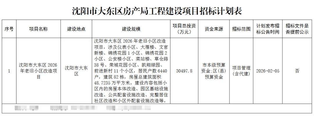 近日,沈阳市大东区房产局工程建设项目招标计划表显示,沈阳市大东区2026年老旧小区改造项目项目管理(含代建)将招标。